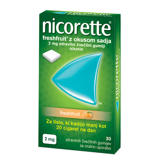 Zdravilo Nicorette Freshfruit zdravilni žvečilni gumiji je zdravilo za zdravljenje zasvojenosti z nikotinom. Namenjeno je za pomoč pri zdravljenju odvisnosti od kajenja z zmanjševanjem potrebe po nikotinu in zmanjšanjem odtegnitvenih simptomov, kar olajša prenehanje kajenja pri kadilcih, ki želijo prenehati s kajenjem, ali pomaga zmanjšati kajenje pri kadilcih, ki nočejo ali ne morejo prenehati s kajenjem.