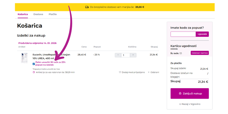 Ko se nahajate v košarici, v polje »Kartica ugodnosti« vpišite 13-mestno številko vaše kartice ugodnosti in kliknite na vijolični gumb »Uporabi«.